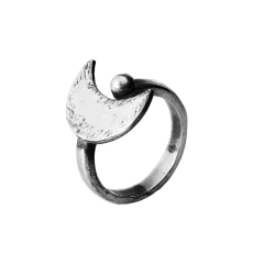 A fully handcrafted ring, made at the bench. The open, adjustable band features two symbolic details: on one side, a hammered and burnished crescent moon that recalls lunar craters; on the other, a polished silver sphere.
