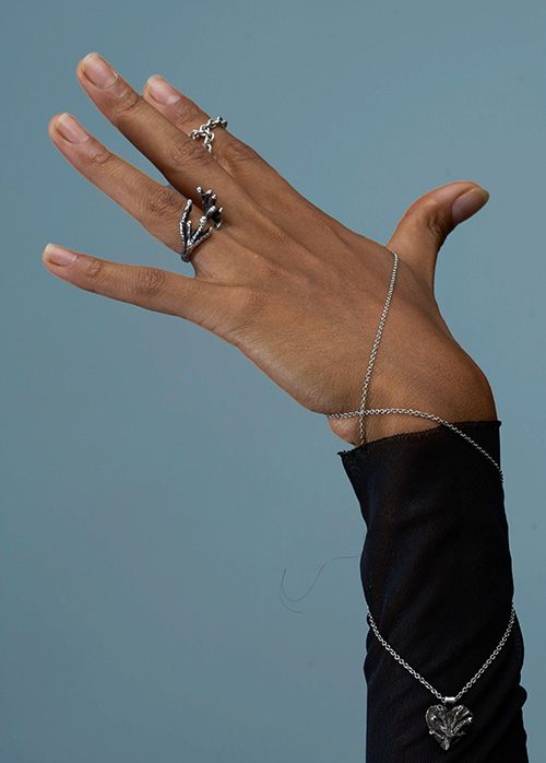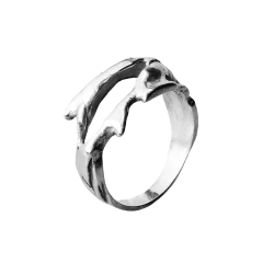 Ring handcrafted using the lost-wax casting technique. The open, adjustable band has been oxidized to emphasize its depth and detail. The design is inspired by seaweed, climbing the finger as if defying gravity, with vertical and irregular forms that evoke the fluid, organic movement of the ocean floor.