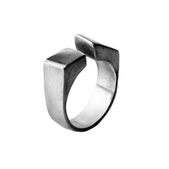 Handcrafted through the lost-wax casting technique, the ring reveals clean, decisive lines with a bold presence. Its smooth, uniform surface enhances the geometry and the sharp contrast between its two ends, while the adjustable opening makes it versatile and effortless to wear.